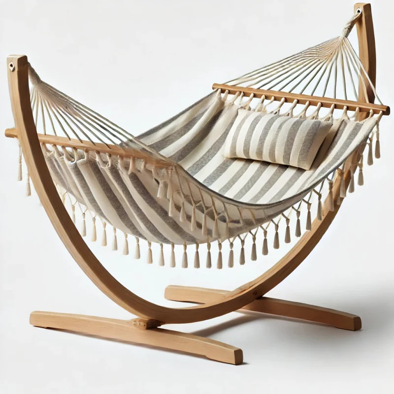 Wygodny hamak ogrodowy wykonany z bawełnianego materiału, z solidnym drewnianym stelażem. Idealny do relaksu w ogrodzie lub na tarasie.
